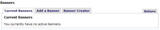 This tab shows you any banner ads you may have already placed on our site and will allow you to view both the number of impressions (how many times your ad has been displayed) as well as how many clicks (how many times a visitor has clicked your ad for more information) your banner has received.